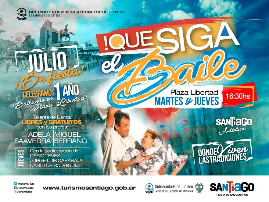 Con motivo de los festejos de la Madre de Ciudades y celebrando un año del taller «QUE SIGA EL BAILE» que se lleva a cabo en plaza libertad todos los martes y Jueves, se baila chacarera de 16:30 a 18:00 hs con show en vivo de Carlitos Rodríguez, Darío Tevez y Jorge Luis Carabajal y la tarde de armonica. IMPERDIBLE